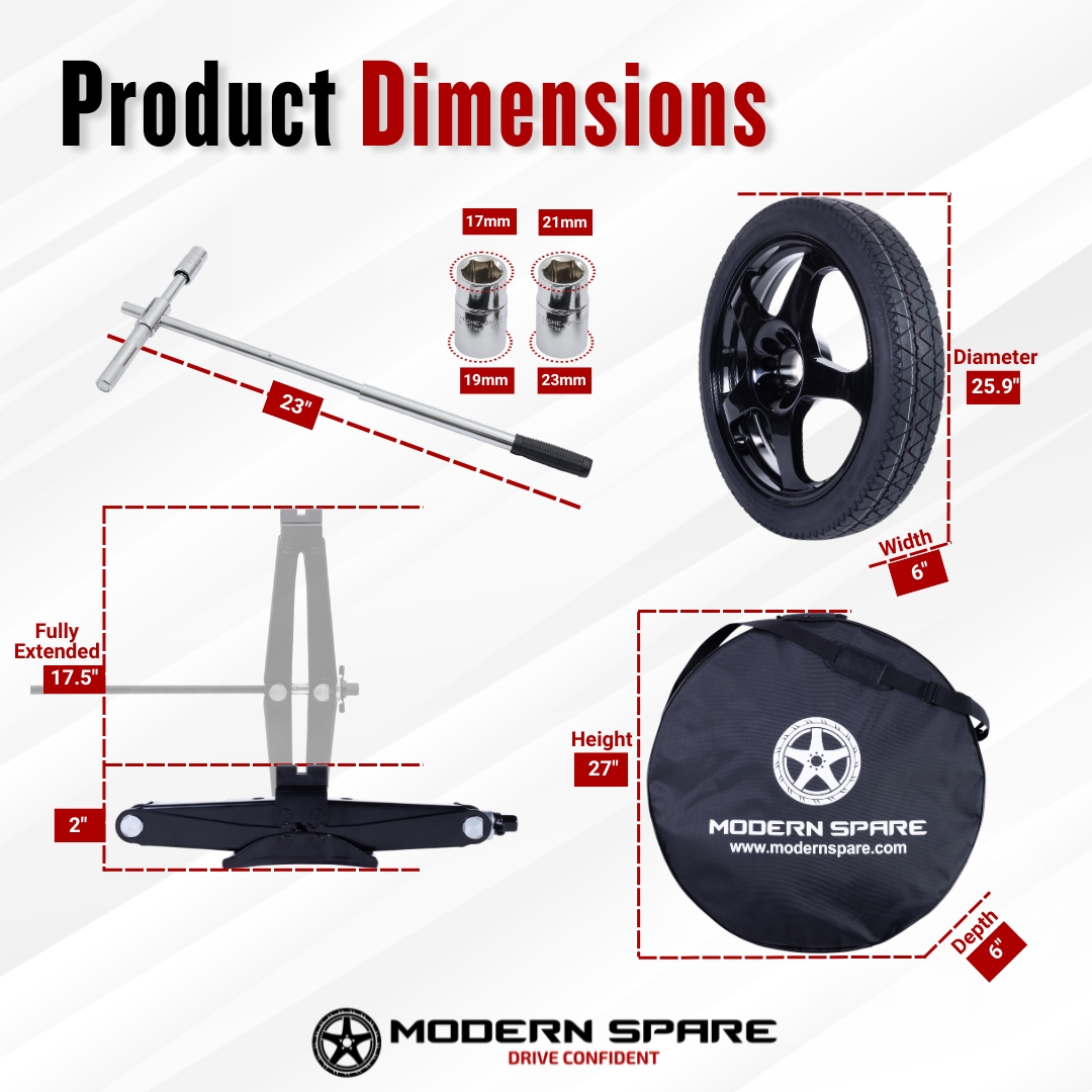 *Not all fitments will result in an exact match in tire diameter. However, Modern Spare ensures that the tire size used for your vehicle model is the proper size and fit for your vehicle (including AWD, High-performance, and EVs).